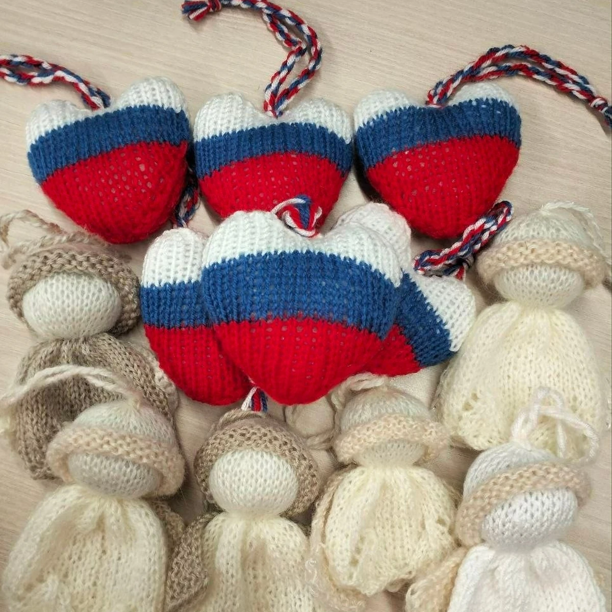 Вязание спицами: мелкие объёмные подвески (сердца и ангелочки), выполненные в основном лицевой гладью с прибавками/убавками и последующей сборкой/набивкой.